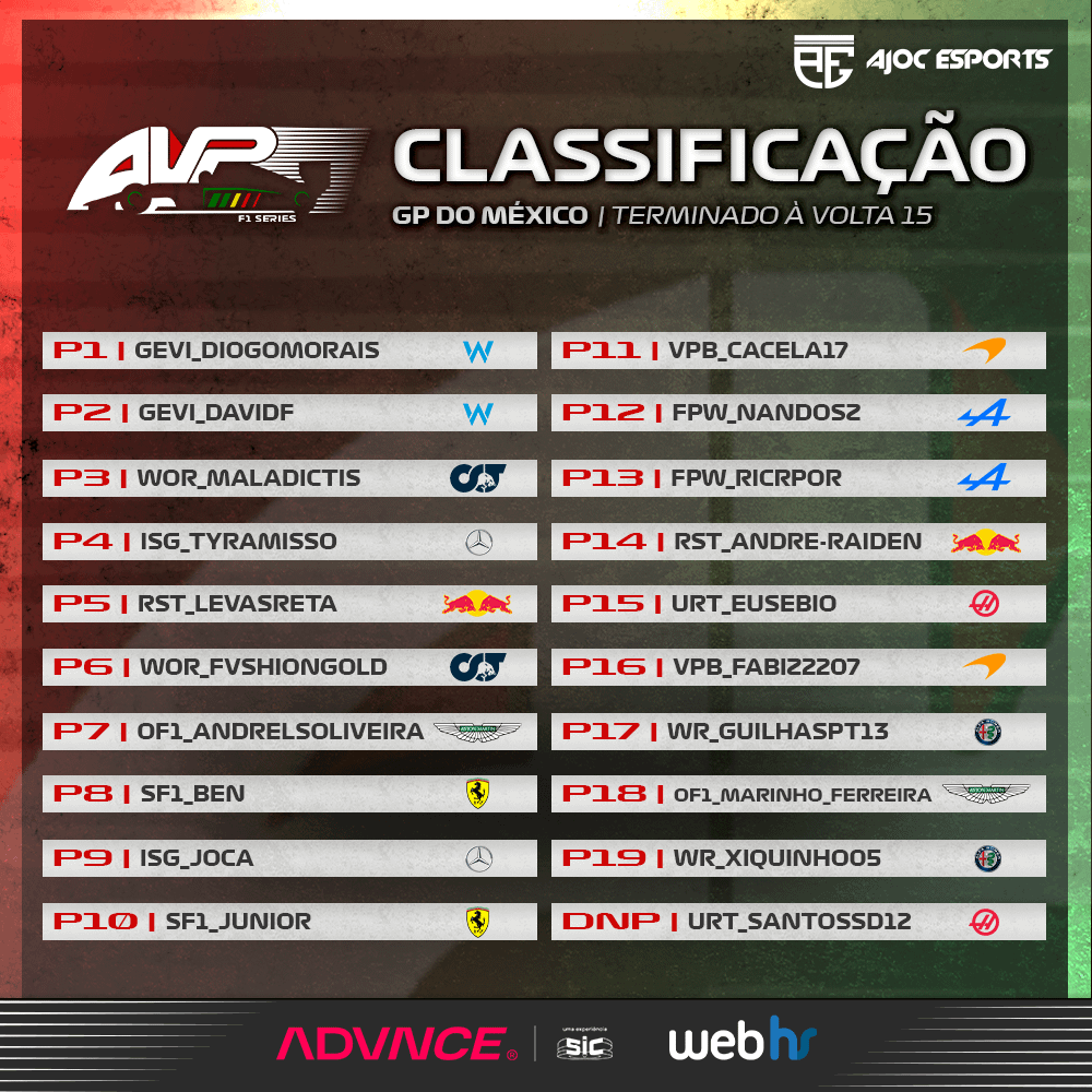 Aqui fica a classificação oficial do Grande Prémio do México, terminado de forma precoce à volta 15.